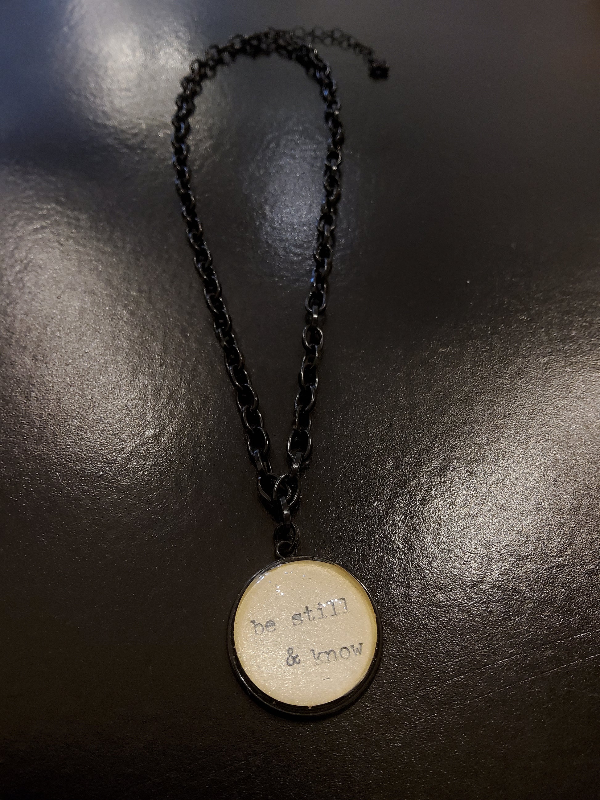 Featuring a typewritten pendant, the 'Be Still and Know' Black Chain Necklace exudes a stunning, yet understated elegance. The shorter black chain adds a modern touch, perfect for everyday wear. A reminder to take a moment to be still and appreciate life's beauty.