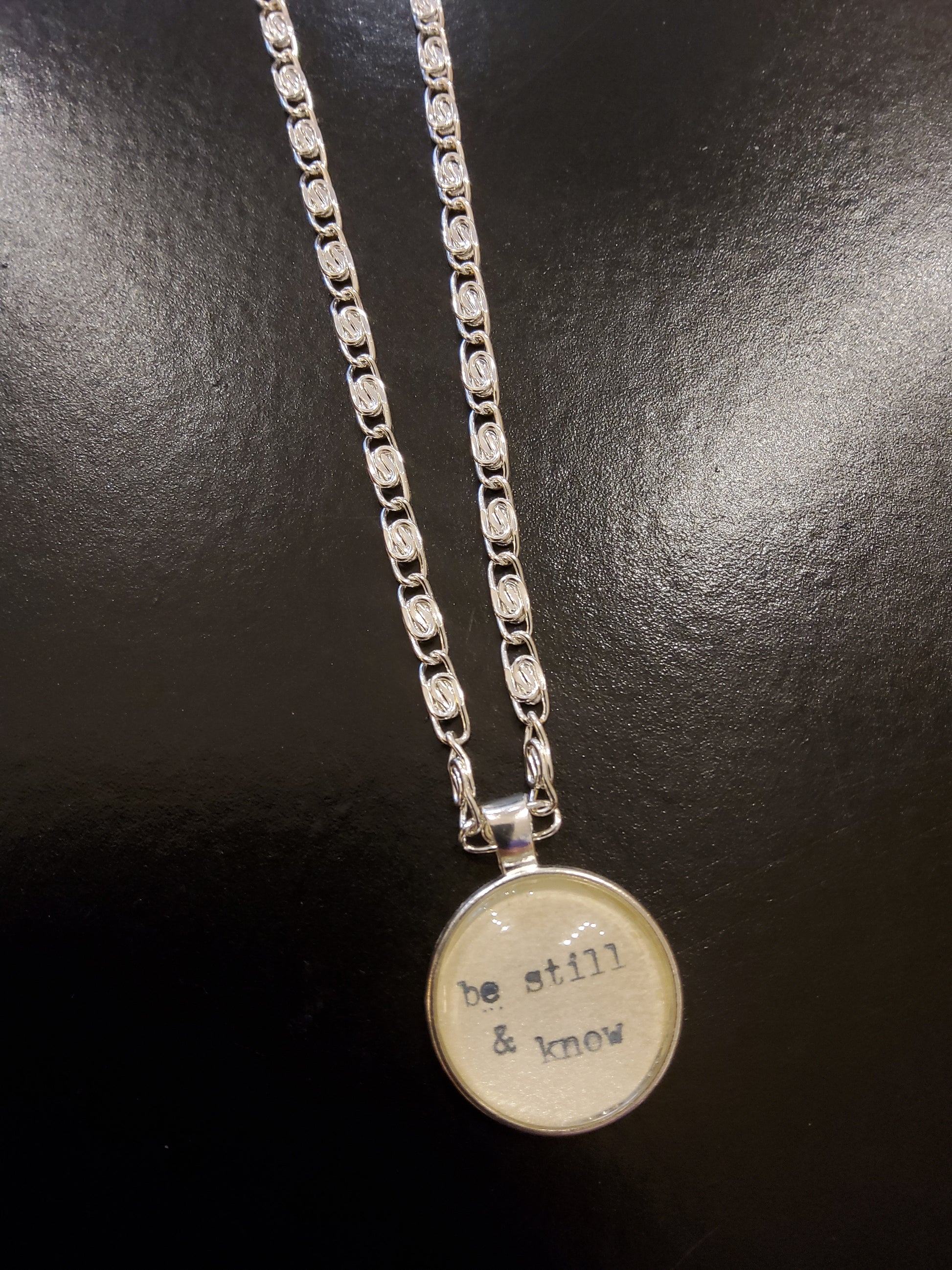 This 'Be Still and Know' Looped Chain Necklace features a typewritten cream pendant that adds a vintage touch to any outfit. The pendant adds a unique and personal touch to your look, making it a great conversation starter. Made with high-quality materials, it is both stylish and durable.