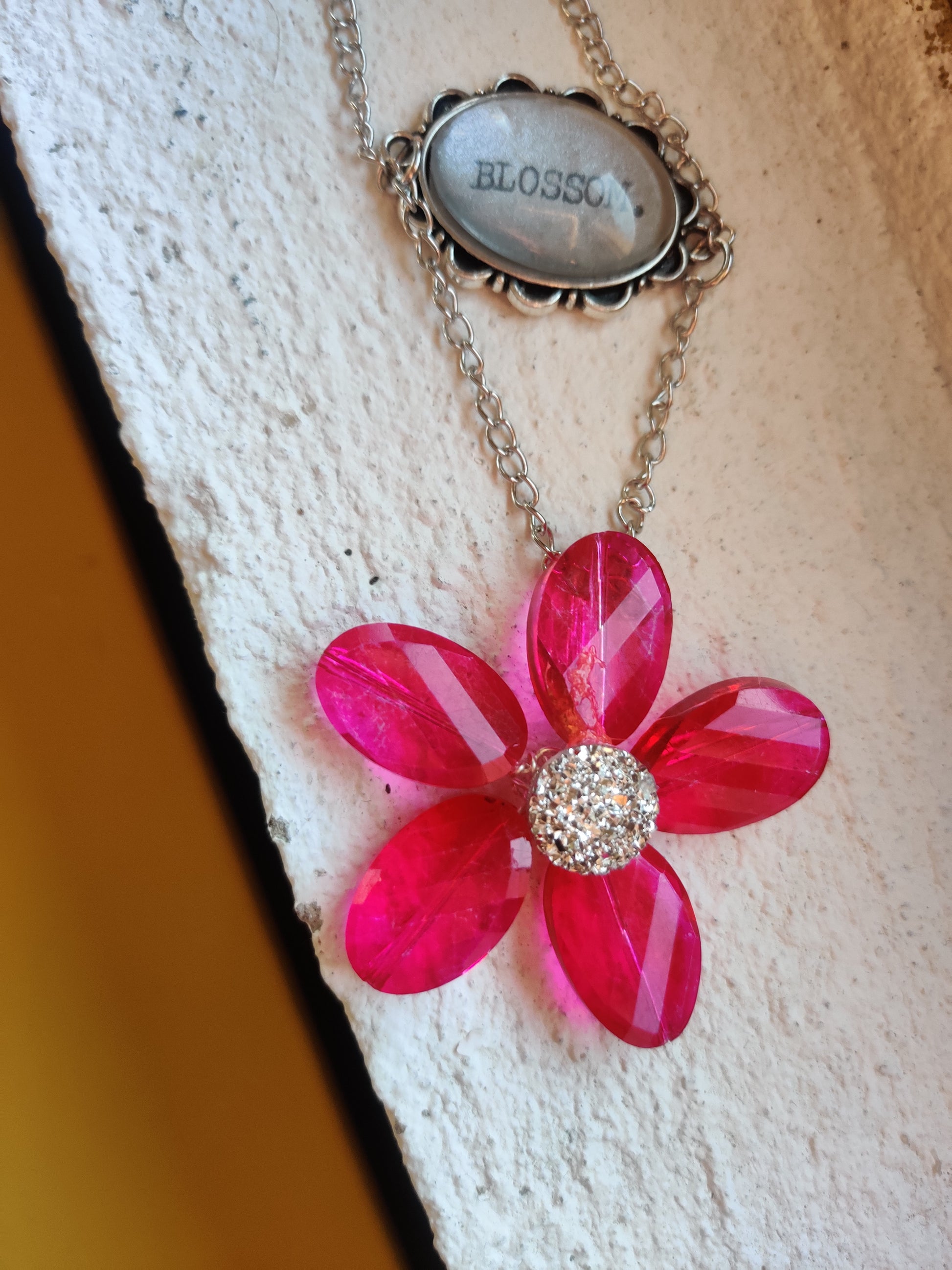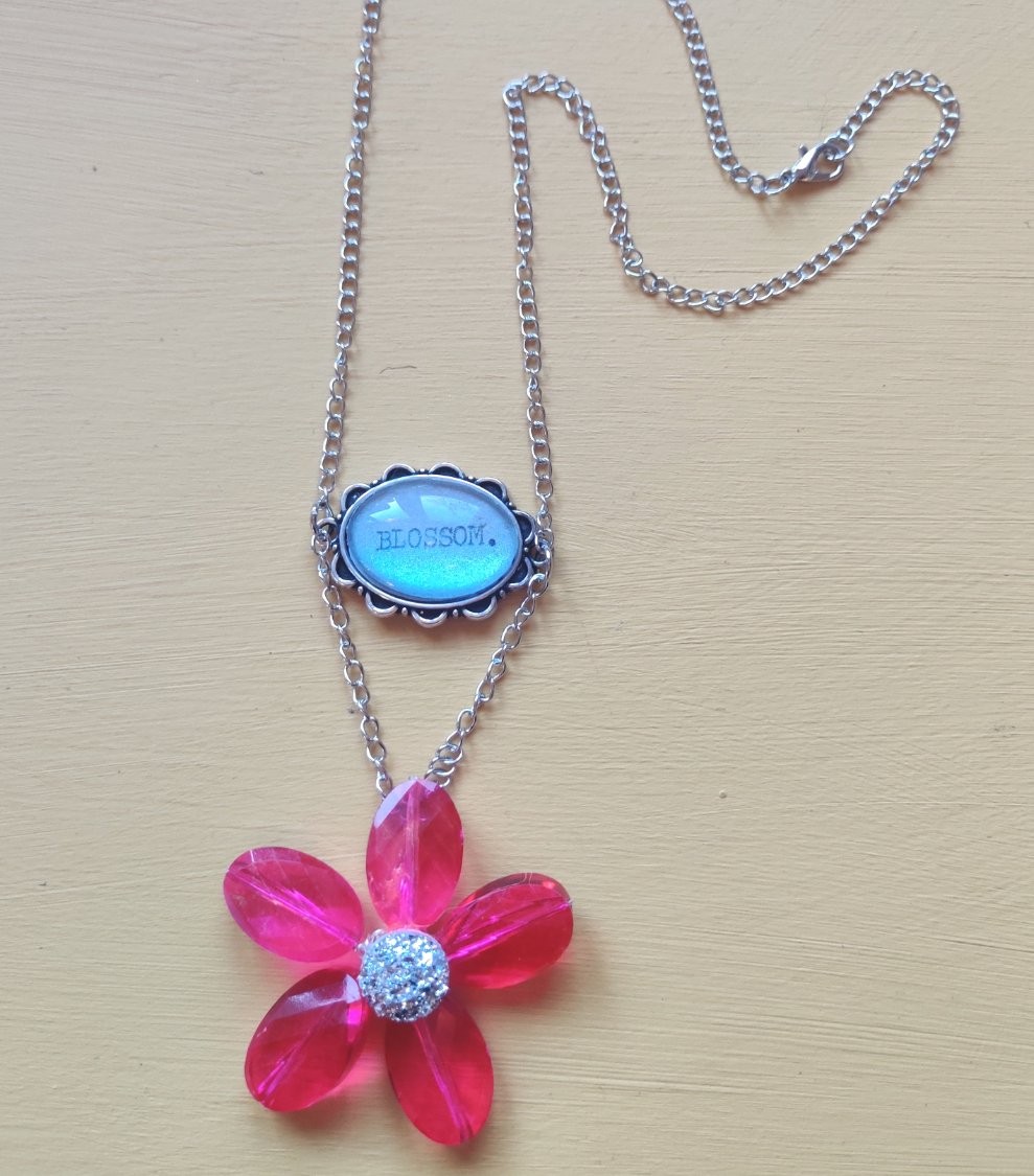 Handwired crystal flower with diamante sparkly centre hanging from typewritten pendant on silver plated chain.