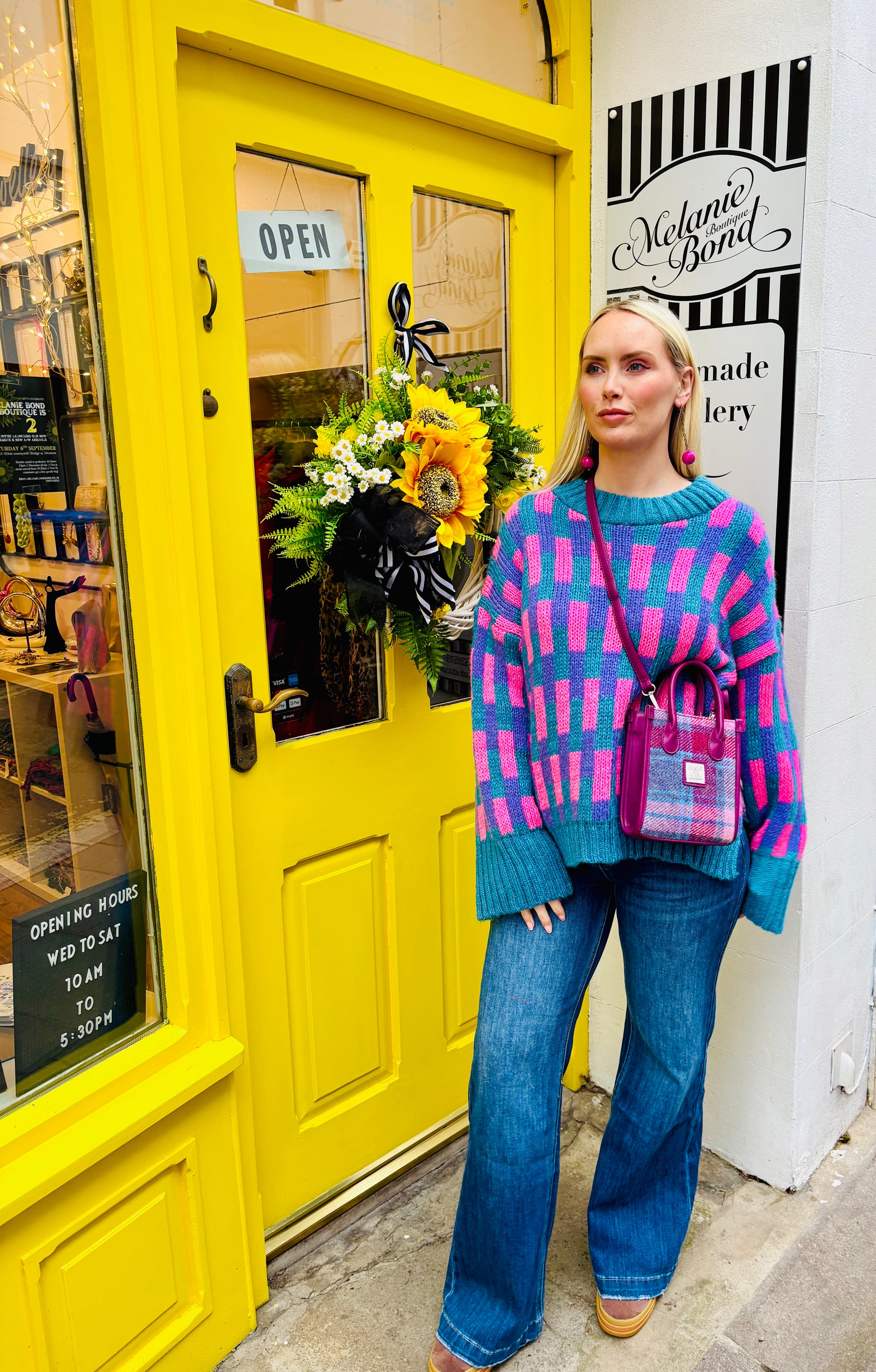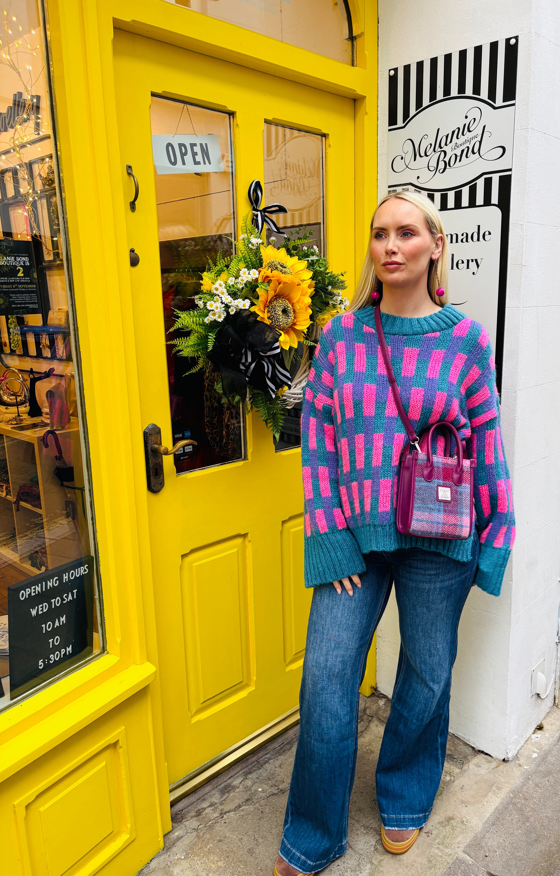 The Charlotte Jumper in Teal is a colour-block knit made to stand out. With a bold stripe palette, oversized silhouette, wide sleeves and a stepped hem with side splits, it’s a fun and flattering shape your customers will love. Made in small batches in the UK using soft vegan yarn.
