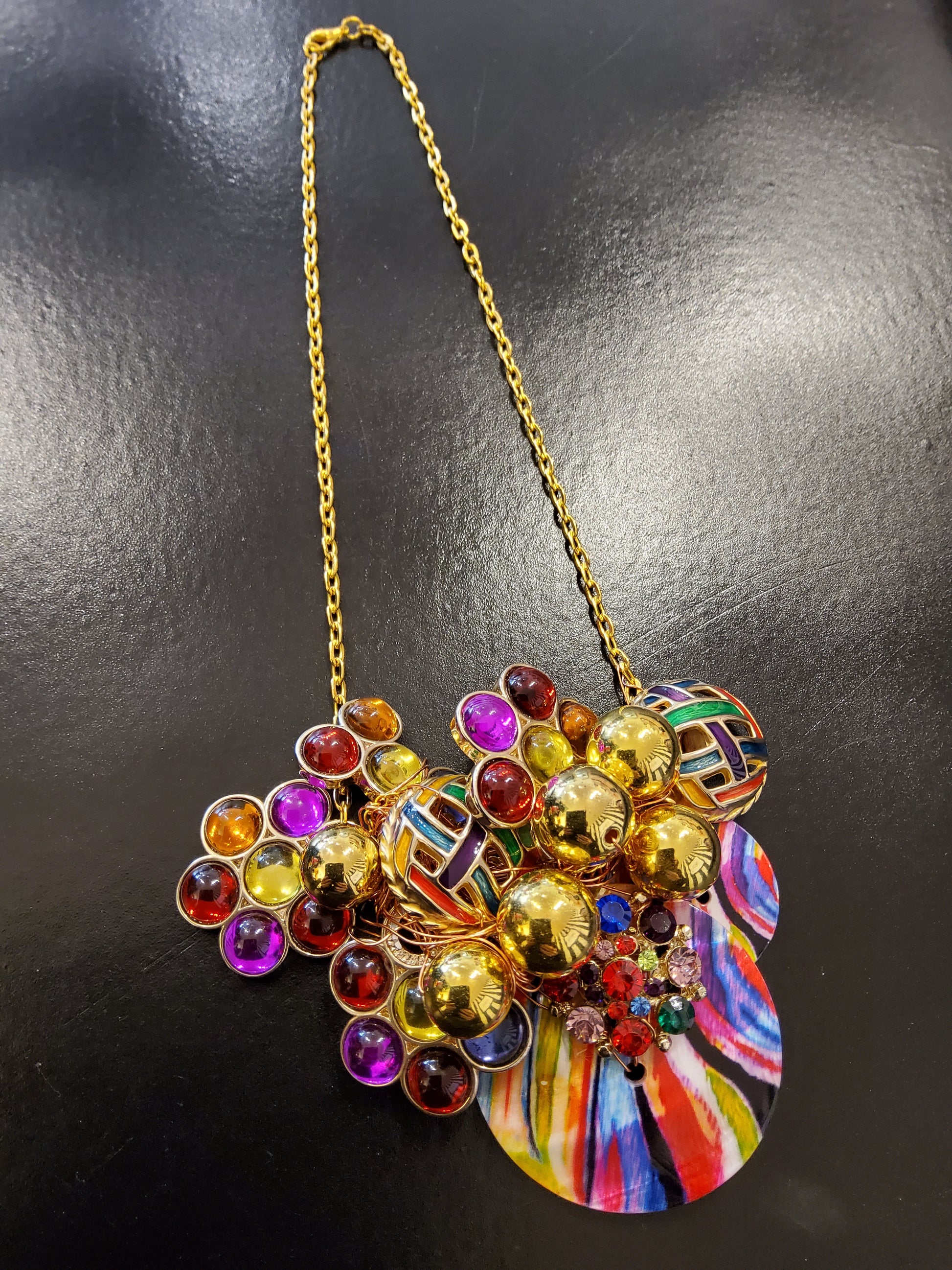 This glamorous gold necklace has a big, eye-catching design that is sure to add the perfect 'wow' factor to all of your outfits. With its stunning, colourful beadwork & buttons, it's a must-have accessory for any fashion-forward individual. Elevate your style with this statement piece. Some of the elements were purchased by Melanie when in Amsterdam in the most beautiful button shop!