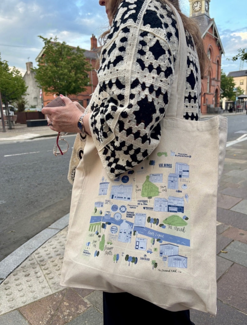 Represent your love for Dromore in style with our Dromore Map Tote Bag designed by Beth Snelling. This stylish bag is not only spacious, making it perfect for everyday use, but also showcases the beauty of Dromore. Add it to your collection and show off your love for our charming town.