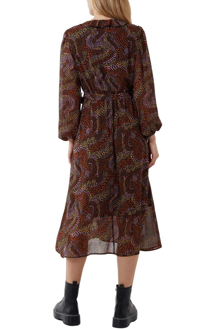 The perfect casual, yet cute piece, this wrap midi dress is comfortable and stylish with its swirl abstract dot pattern and ruffle collar. Ideal for down days or dressing up.