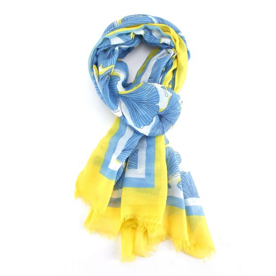 This delicate floral scarf is both soft and lightweight, making it the perfect addition to any outfit. The beautiful blue with a pop of yellow makes it a vibrant accessory, perfect for summer. Stay comfortable and stylish with this must-have scarf.