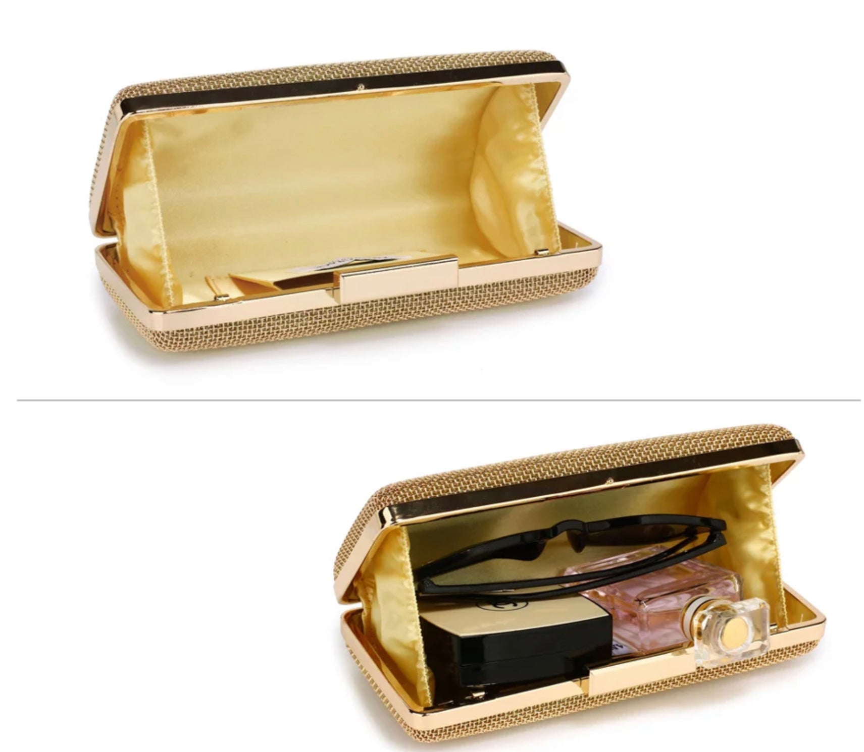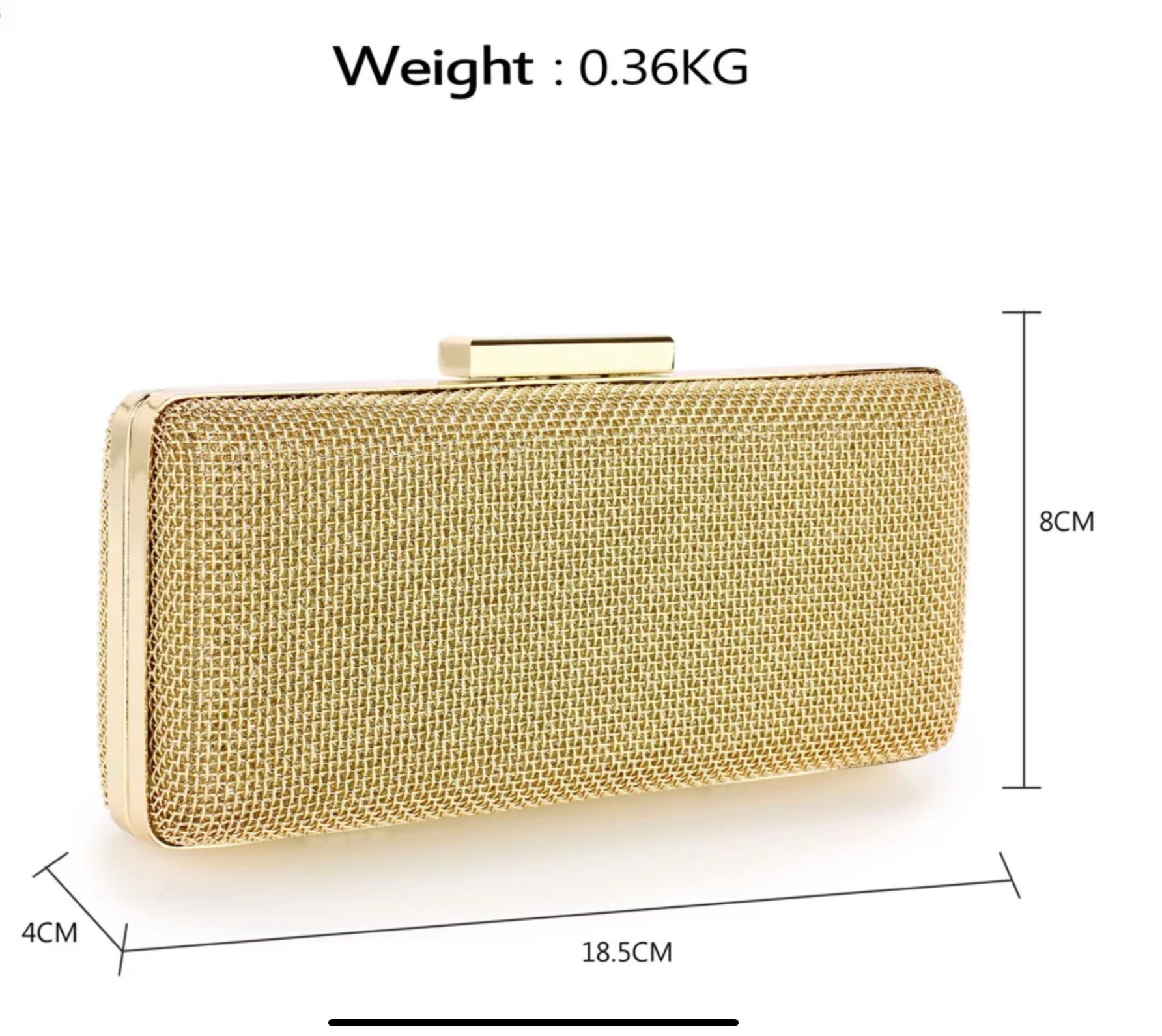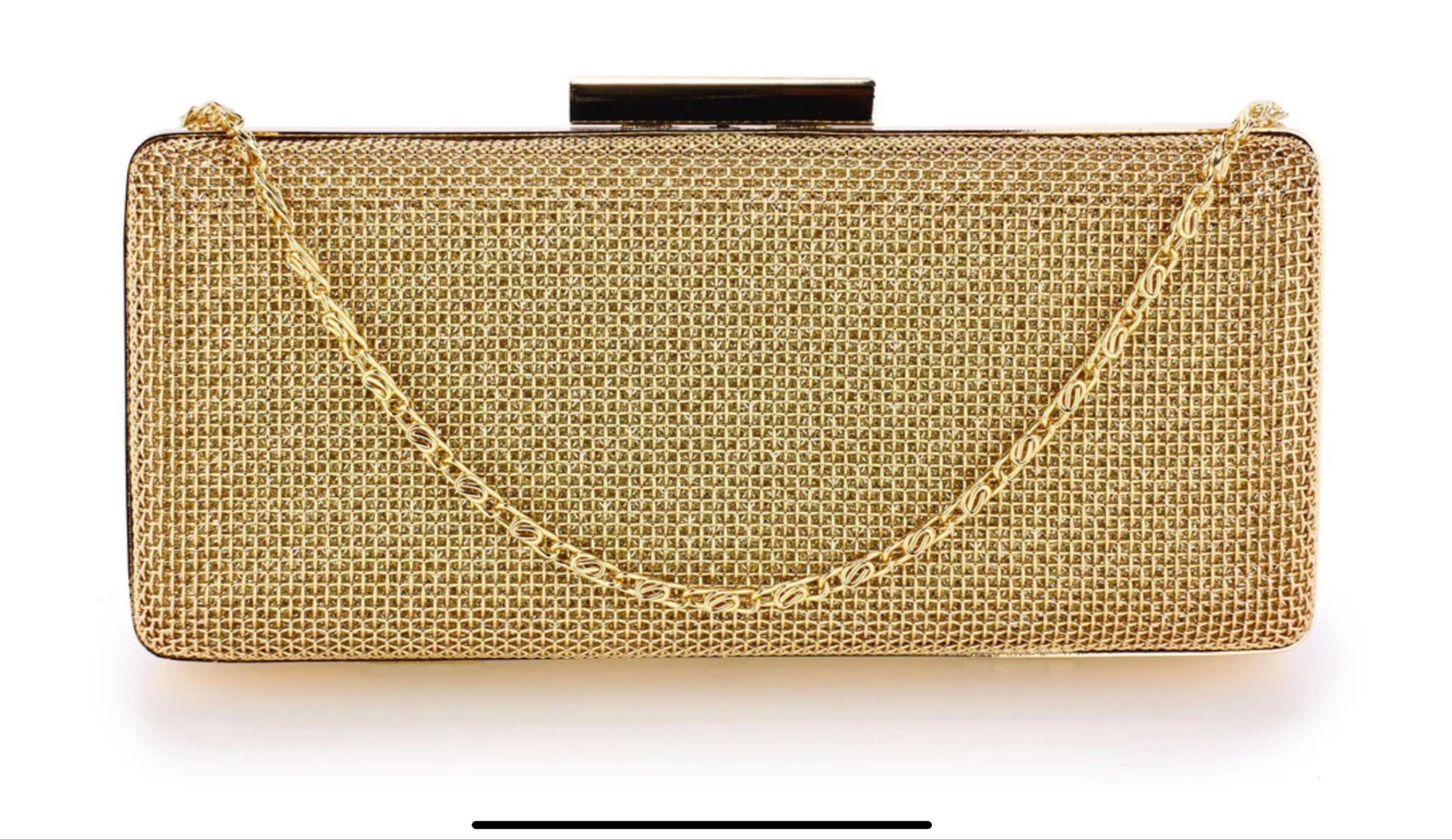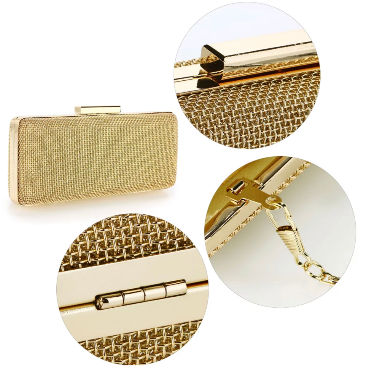 This elegant metal mesh clutch bag adds a touch of sparkle to any special occasion. Crafted from shining gold metal mesh, the clutch bag is perfect for any formal event. This timeless design is sure to make a statement.