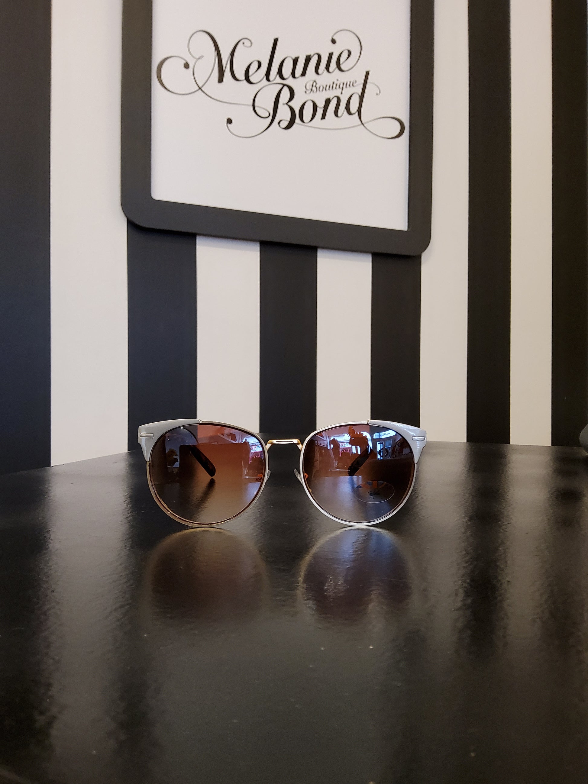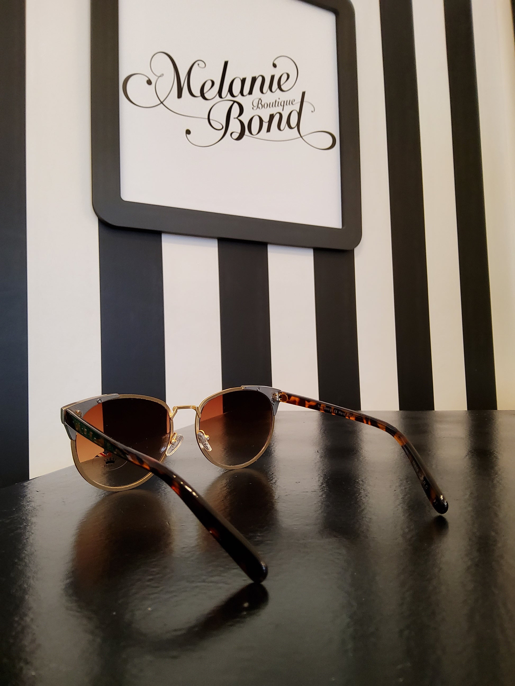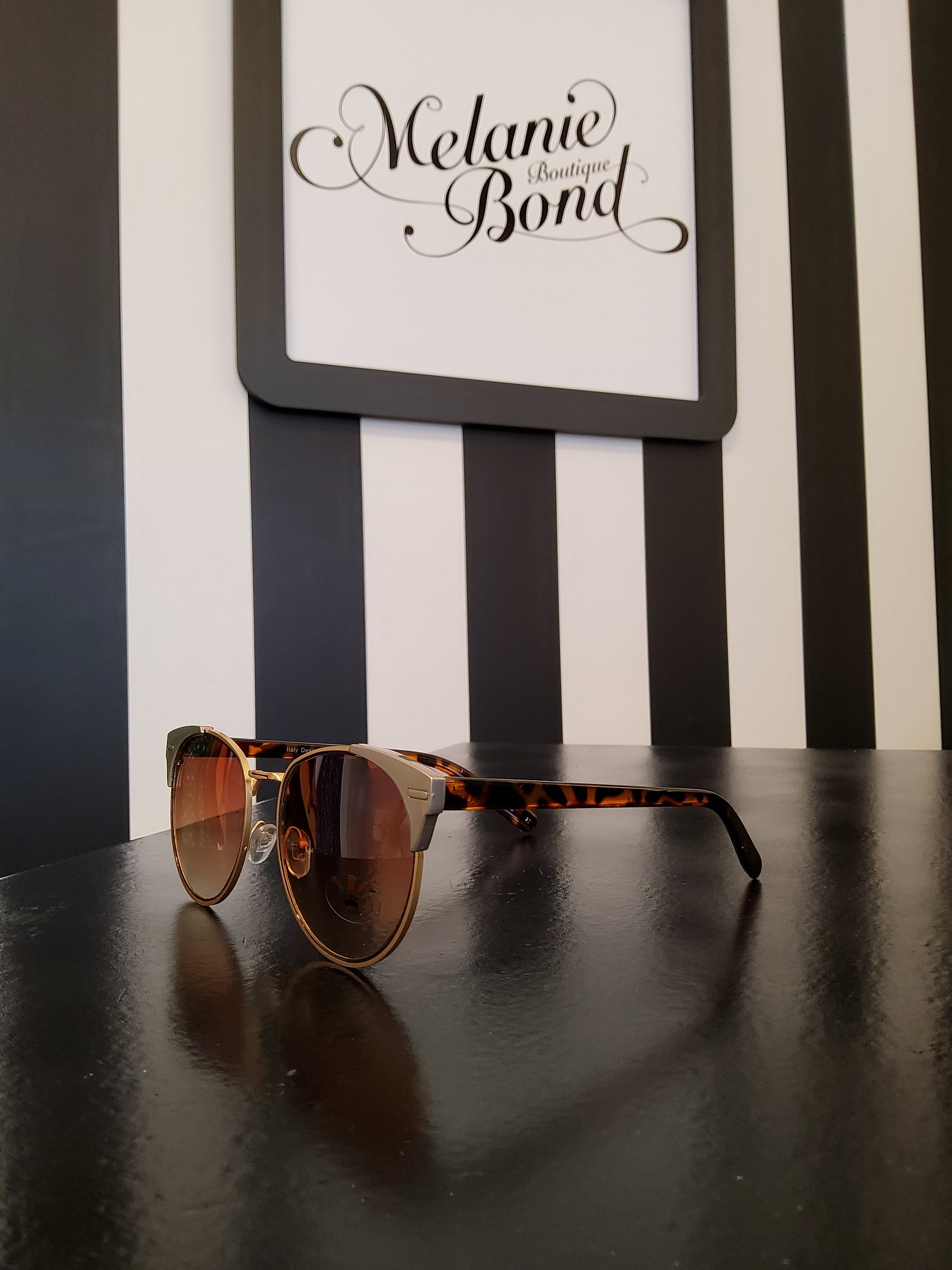 These sunglasses are a durable and fashionable summer essential! The tortoiseshell legs, gold rim, grey edge detail, and bronze lens tint provide both style and protection from the sun. A must-have for any fashion-conscious individual.