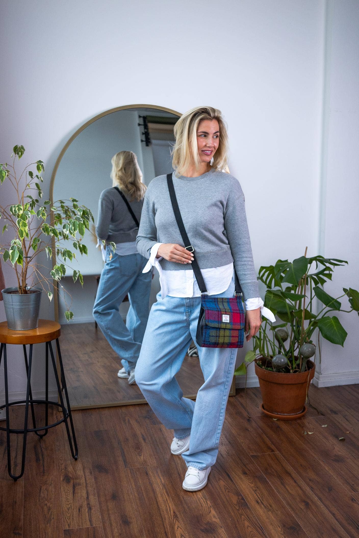Crafted in Harris Tweed with leather accents, it features a handy open pocket at the front and secure zip pockets on the back and inside.