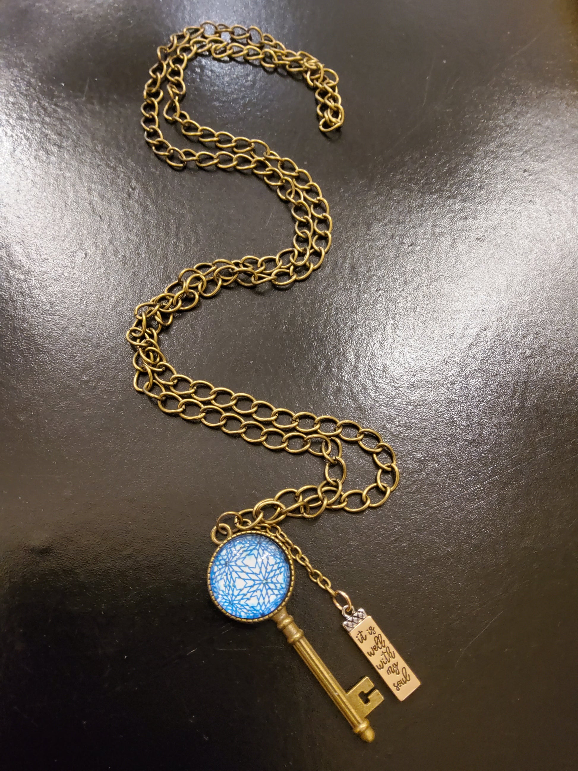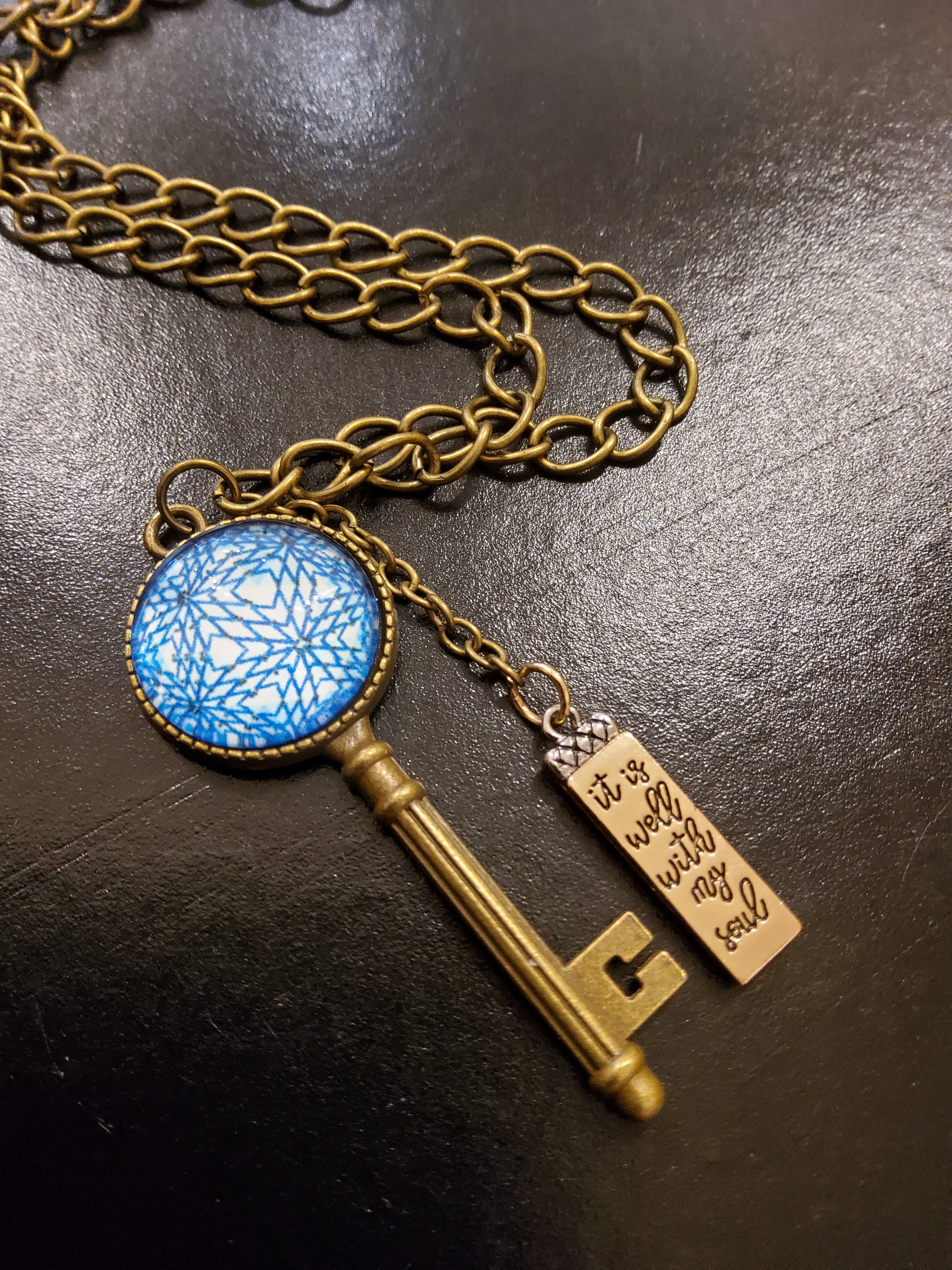 This 'It is well with my soul' Blue Key Necklace features a long bronze chain and a stunning blue key charm. With its elegant design, it is the perfect accessory to add a touch of beauty to any outfit. The 'It is well' charm serves as a reminder of inner strength and resilience.