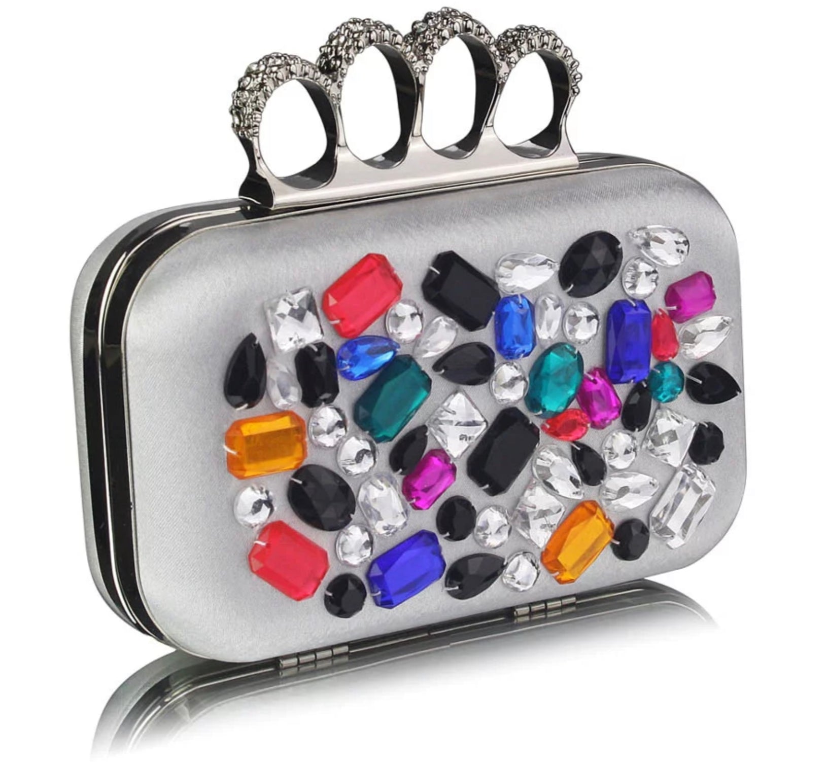This elegant clutch adds a glamorous touch to any evening outfit. With a soft-touch exterior and a rhinestone-encrusted knuckle handle, this clutch is sure to dazzle. It also comes with a long chain for wearing as a shoulder bag. The colours are just gorgeous! A stunning bag that will certainly turn heads!