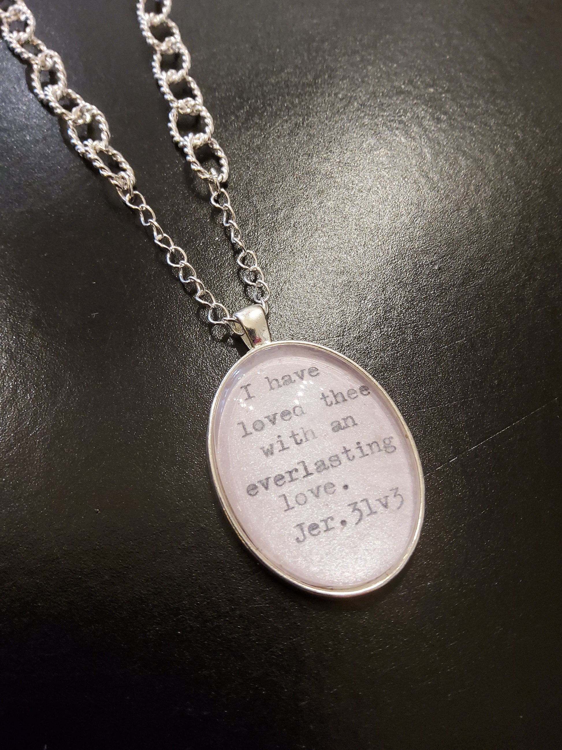 Add a touch of elegance and faith to your outfit with the Jeremiah 31 v 3 Silver Loop Necklace. The pink typewritten verse pendant is a beautiful reminder of God's never-ending love, while the durable silver loop chain adds a touch of sophistication. A perfect accessory for any occasion.
