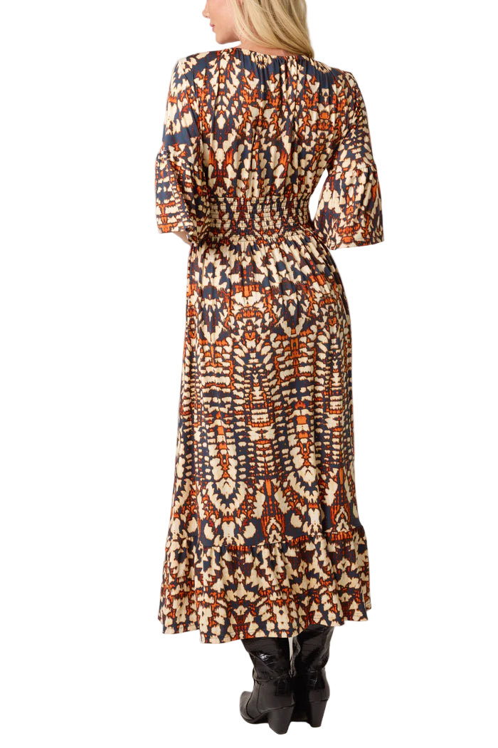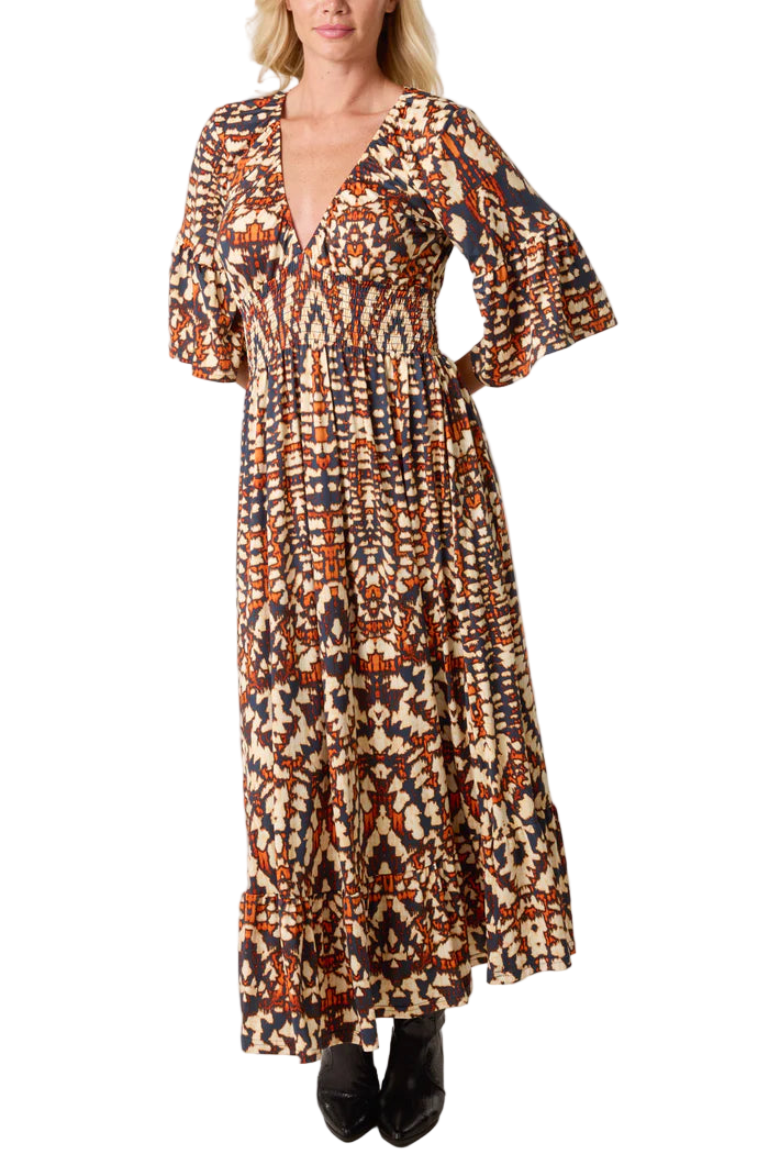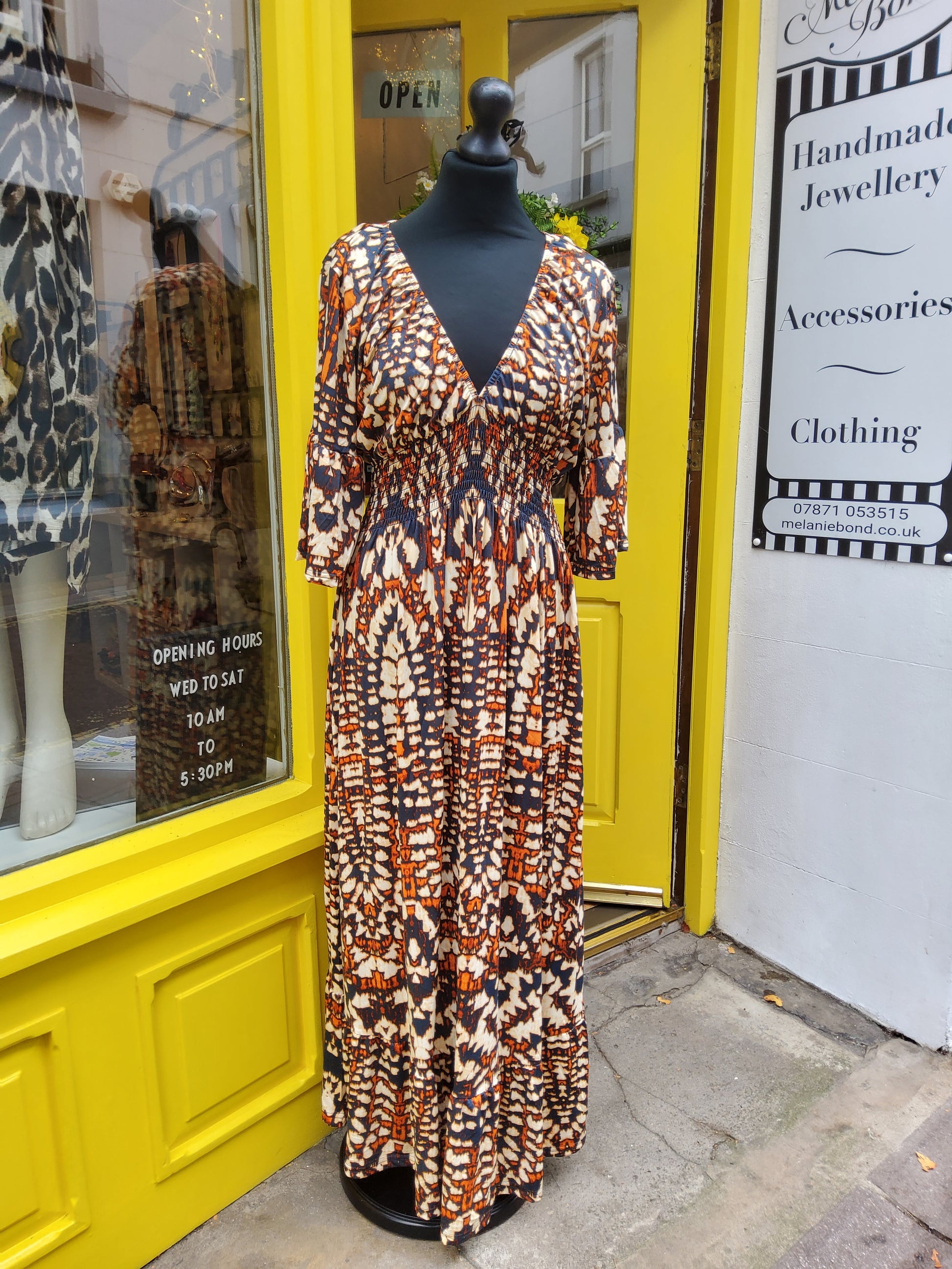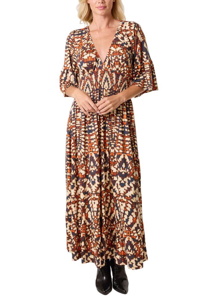 Experience effortless elegance with the Kaleidoscope Print Shirred Stretch Dress. Crafted from a comfortable stretch fabric, this dress offers a flattering fit that moves with you. Its modern print in rich autumnal tones makes it a perfect choice for the season, combining style and versatility for any occasion.