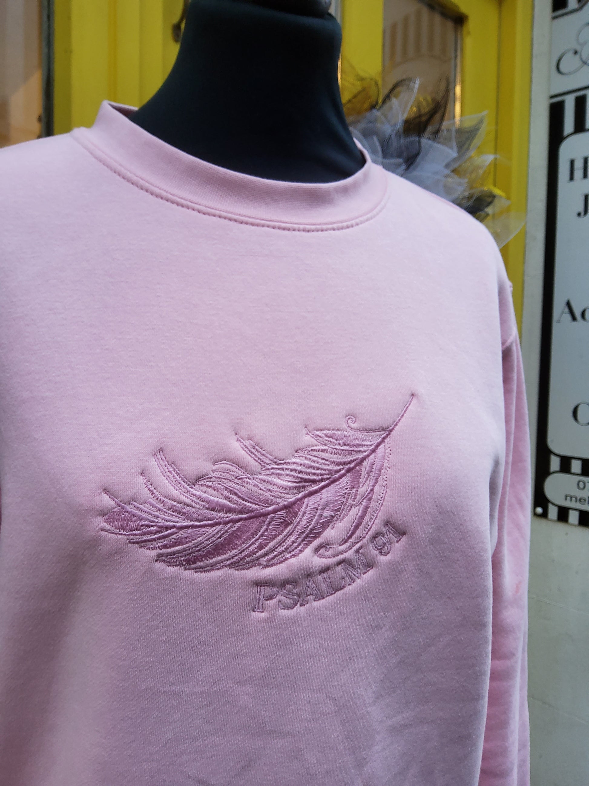 The Light Pink Psalm 91 Sweatshirt combines comfort with a meaningful design. Its soft fabric ensures all-day wear, while the embroidered Psalm 91 detail and feather accentuate its unique faith-based aesthetic. This piece serves as a subtle yet powerful statement.