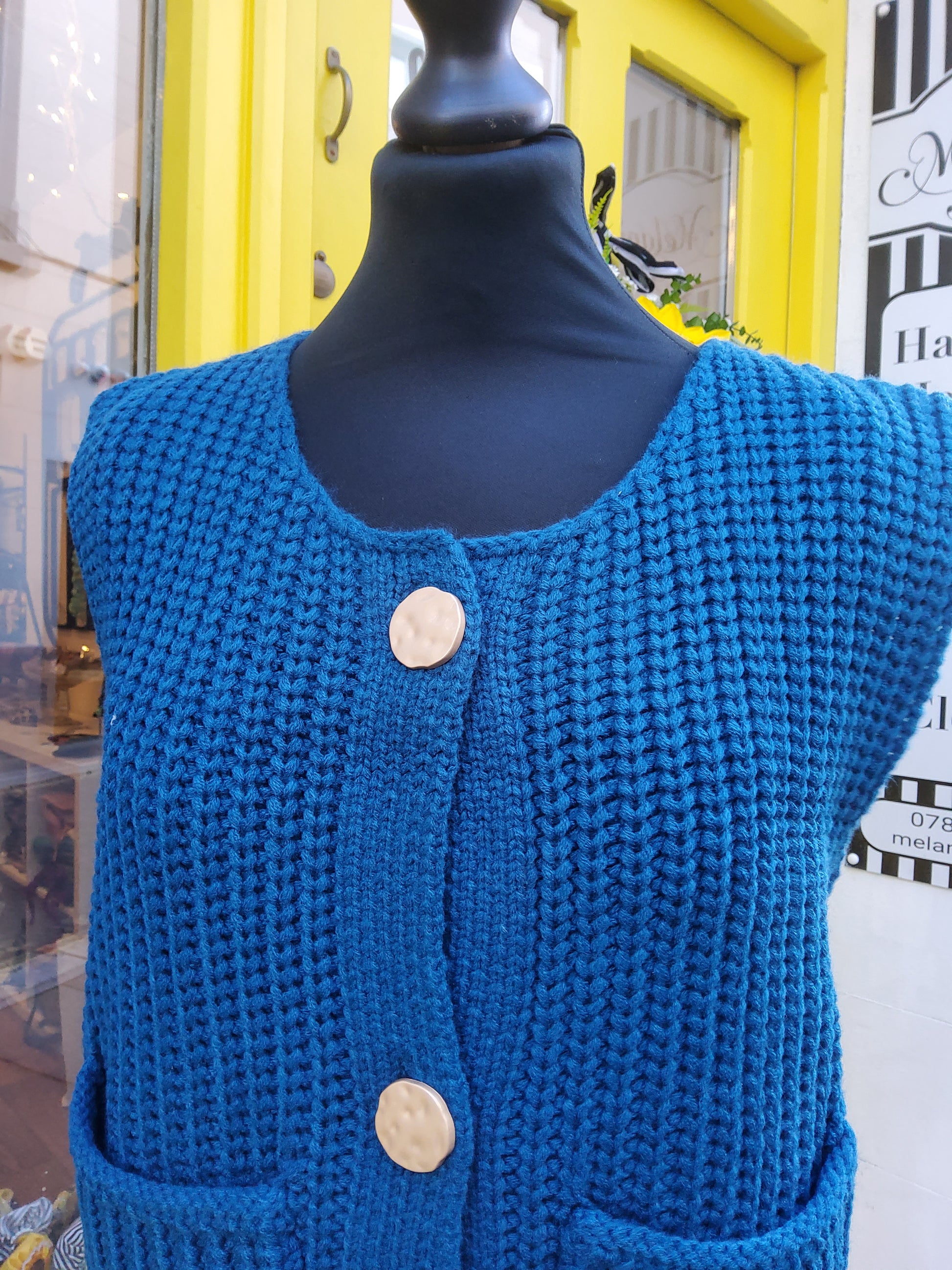 Expertly crafted with a knitted pattern and accented with funky gold buttons, our Petrol Blue Knit Waistcoat is the perfect addition to any stylish wardrobe. Not only does it provide a cosy layer for colder days, but it also adds a touch of fun and flair to this season's fashion.