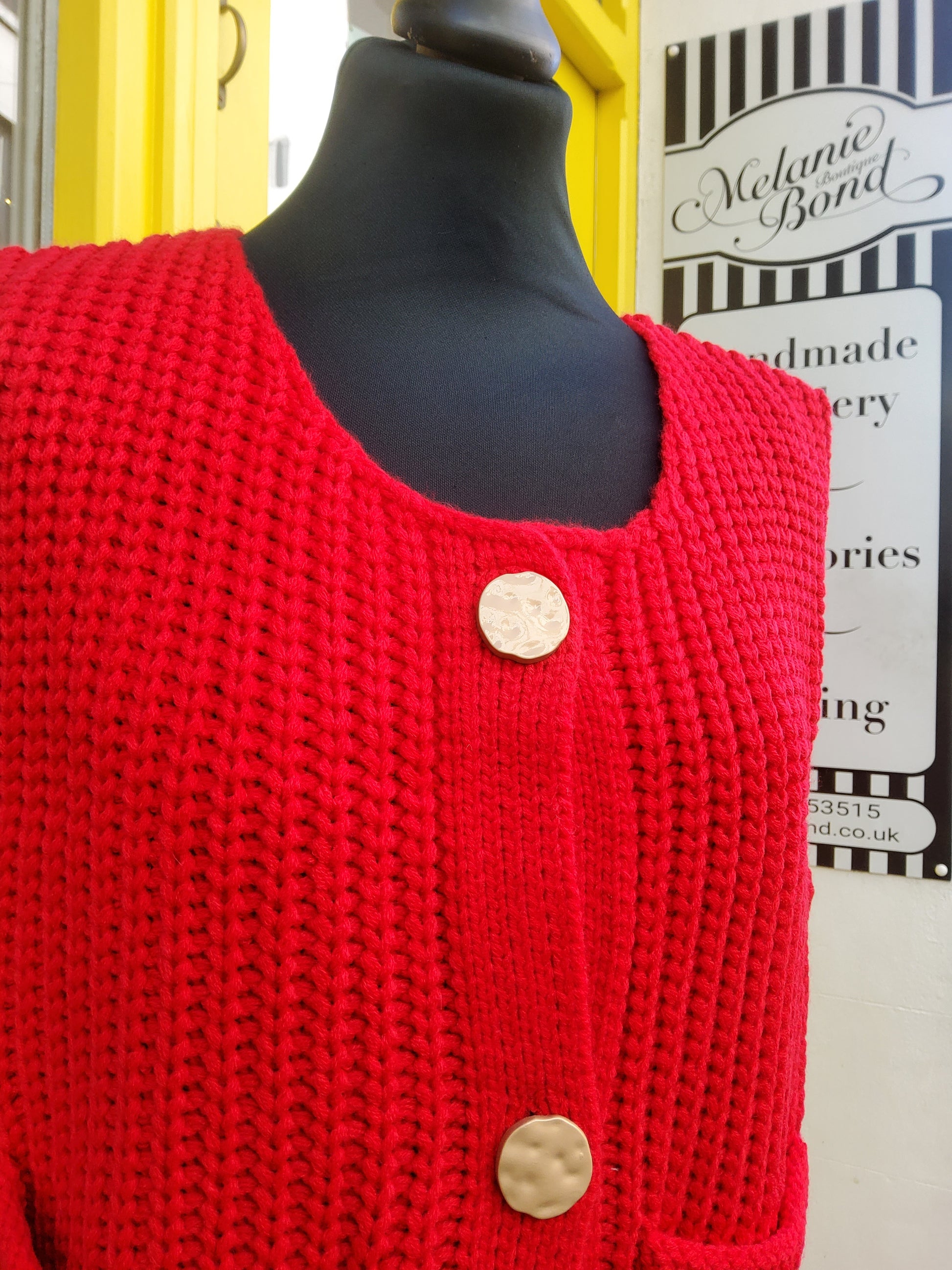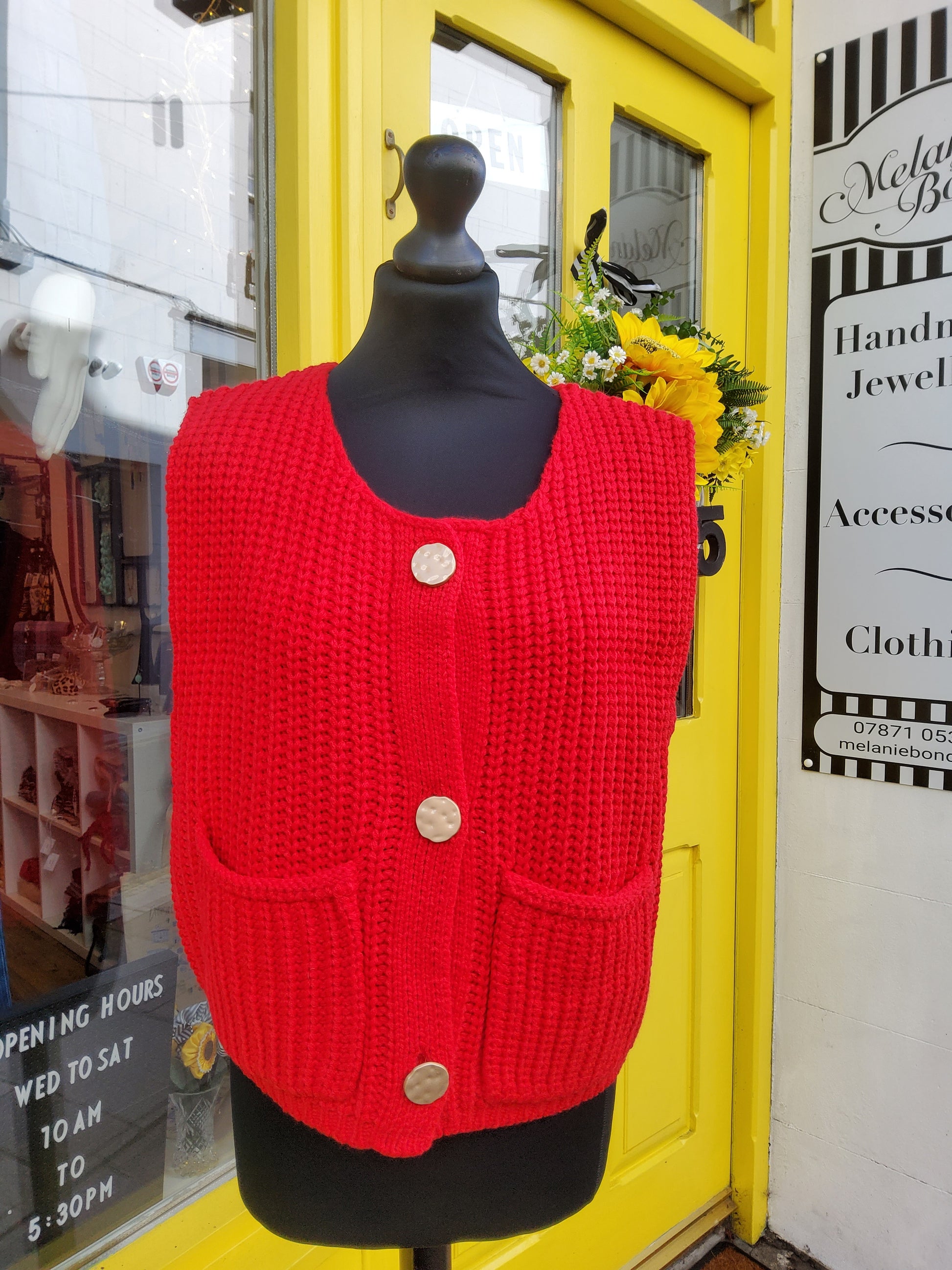 Expertly crafted with a knitted pattern and accented with funky gold buttons, our Red Chunky Knit Waistcoat is the perfect addition to any stylish wardrobe. Not only does it provide a cosy layer for colder days, but it also adds a touch of fun and flair to this season's fashion.