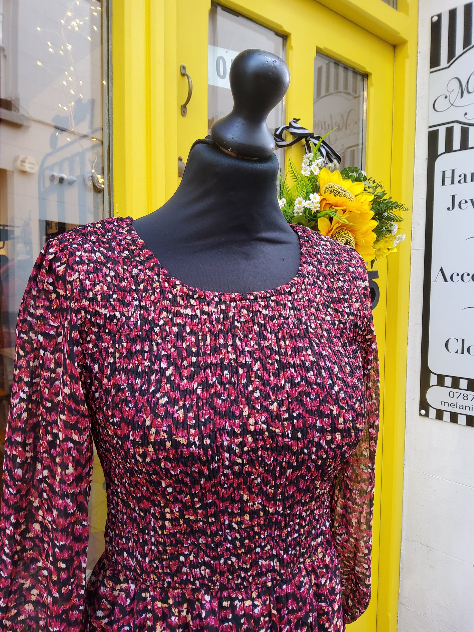 Effortlessly elegant, this floaty and lightweight Speckled Burgundy Shirred Bodice Dress is the perfect addition to your wardrobe. The stretchy bodice creates a flattering silhouette, making you feel confident and gorgeous. Perfect for any occasion, this dress is both comfortable and stylish.
