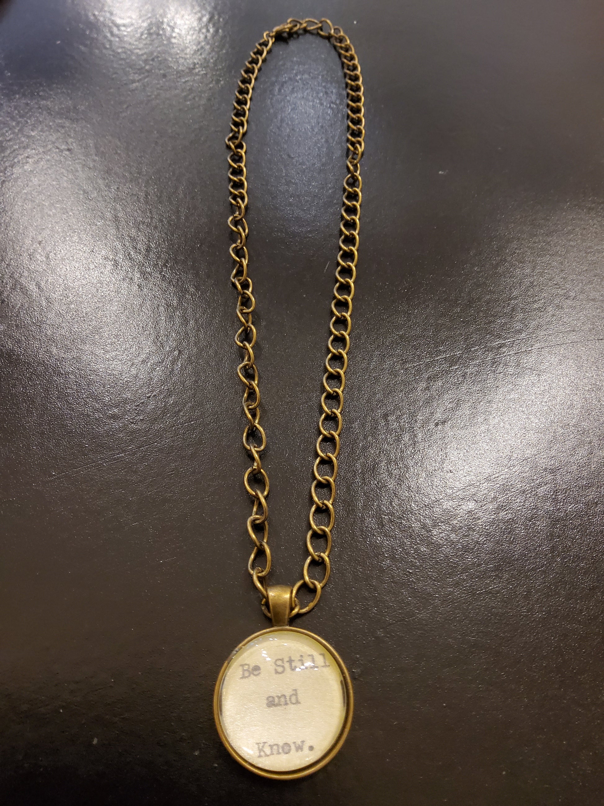 This 'Be Still and Know' Bronze Necklace features a typewritten pendant on a beautiful bronze chain. Its elegant design offers a sense of serenity and serves as a timeless reminder for reflection. Crafted with stunning detail, this necklace is a gorgeous addition to any jewellery collection.