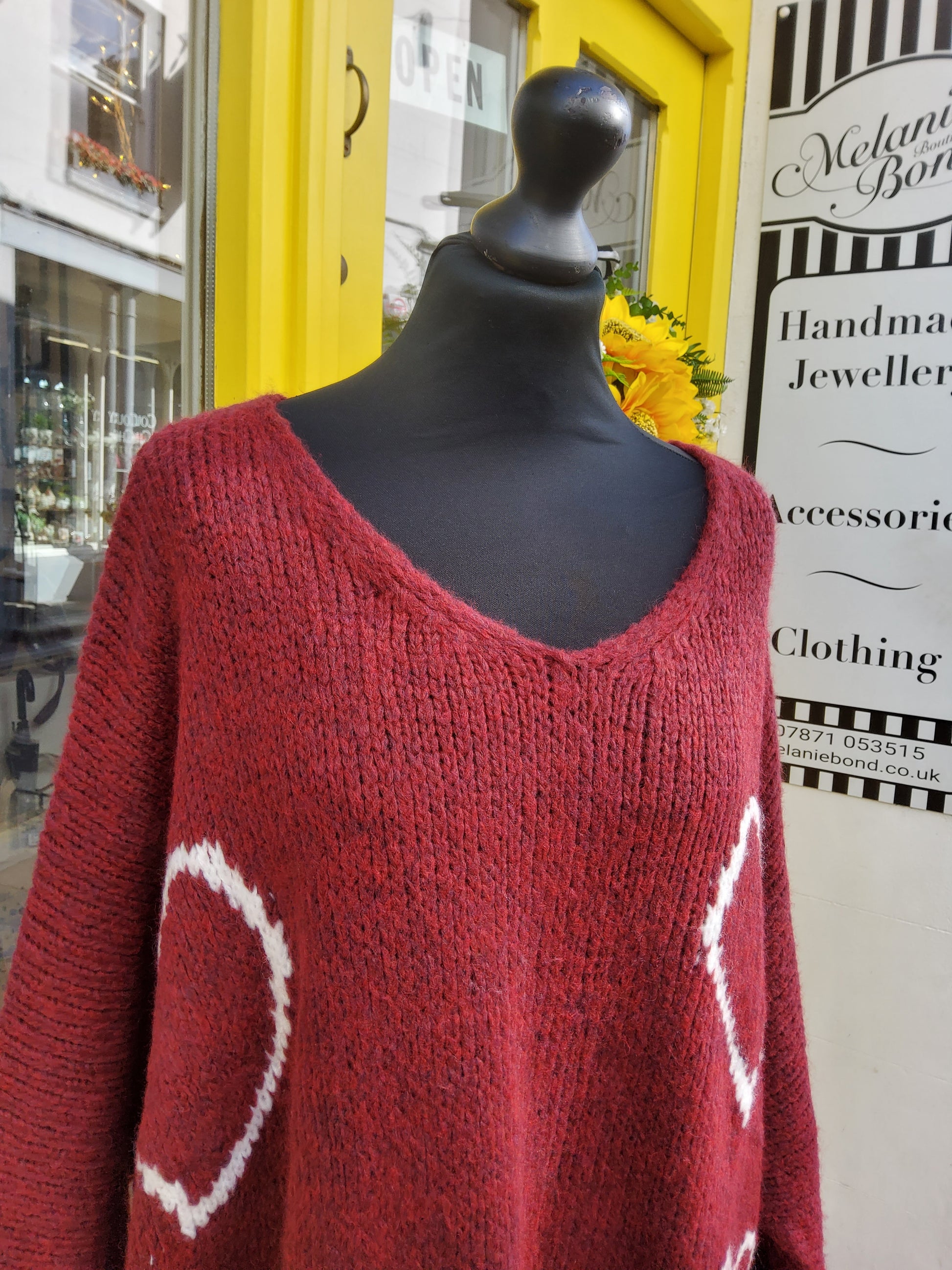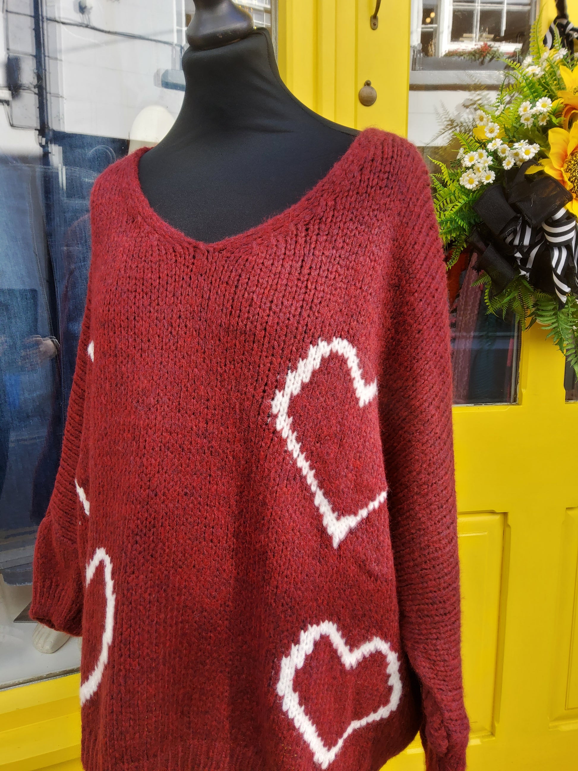 Stay cozy this season with our V-Neck Burgundy Heart Jumper. Made with soft, comfortable fabric in a perfect one size fit. Add a touch of warmth and style to your wardrobe with this must-have jumper.