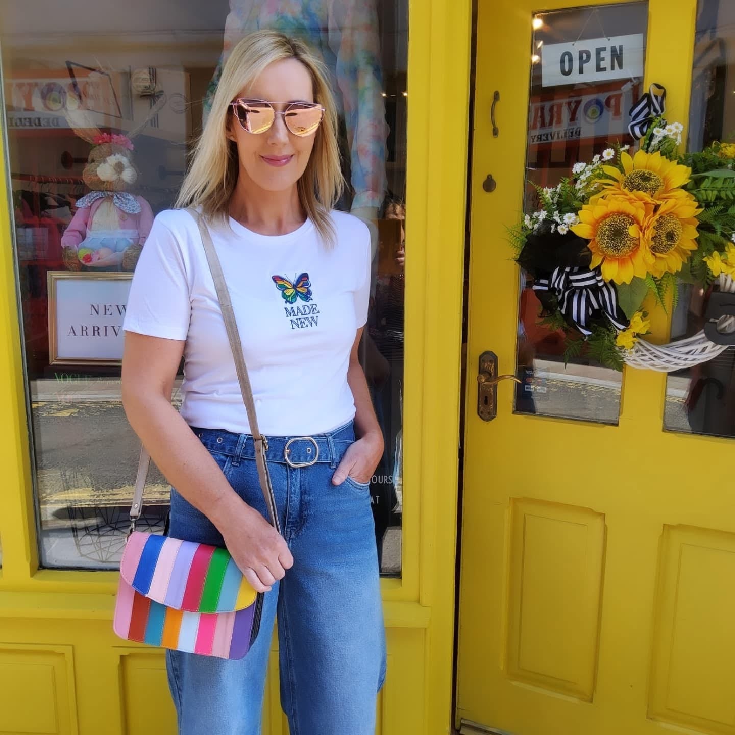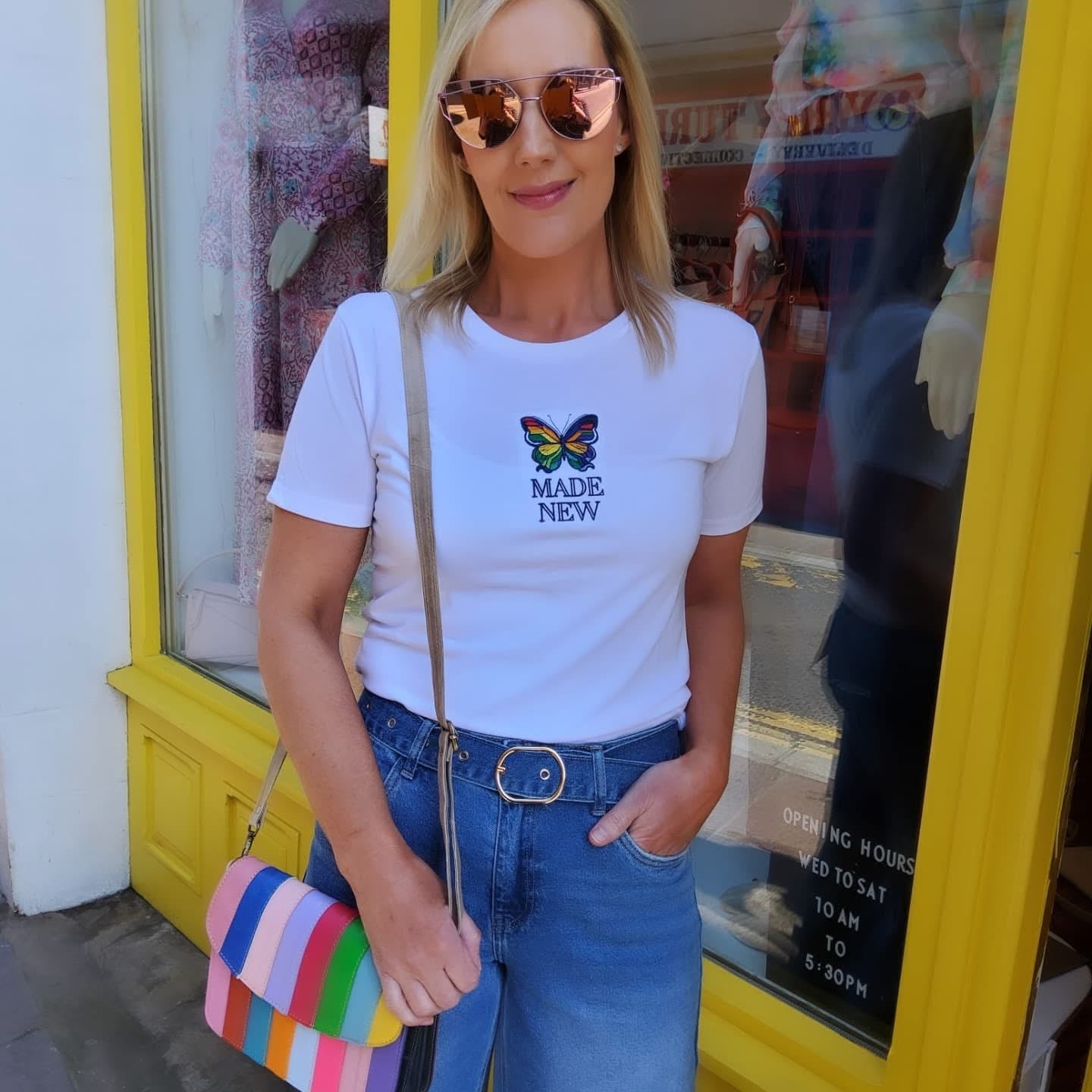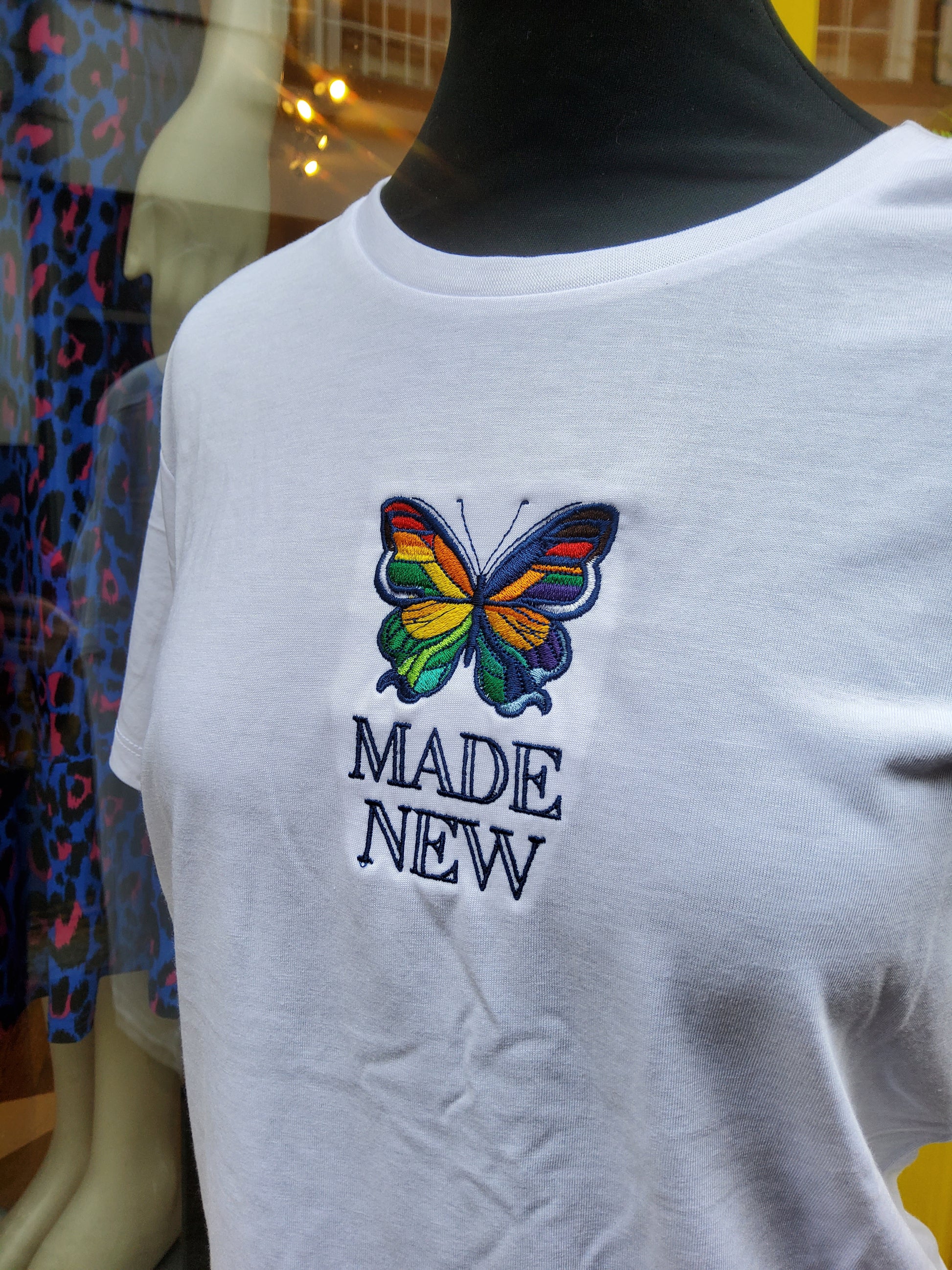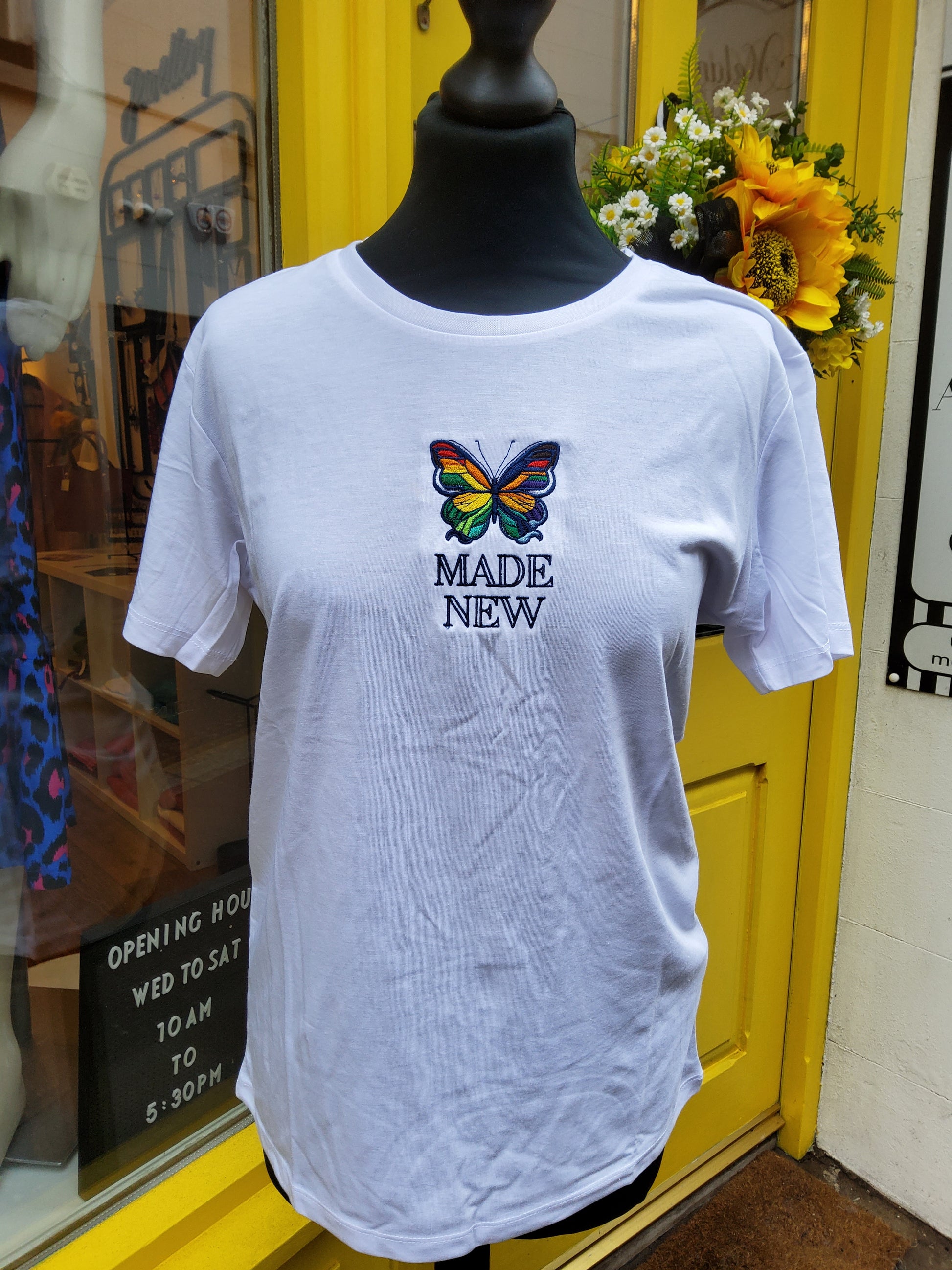 Upgrade your wardrobe with our 'MADE NEW' T-Shirt, crafted from soft material for maximum comfort. The flattering fit will make you feel confident and stylish. Complete with an embroidered butterfly, this tee is a must-have for any fashion-forward individual.