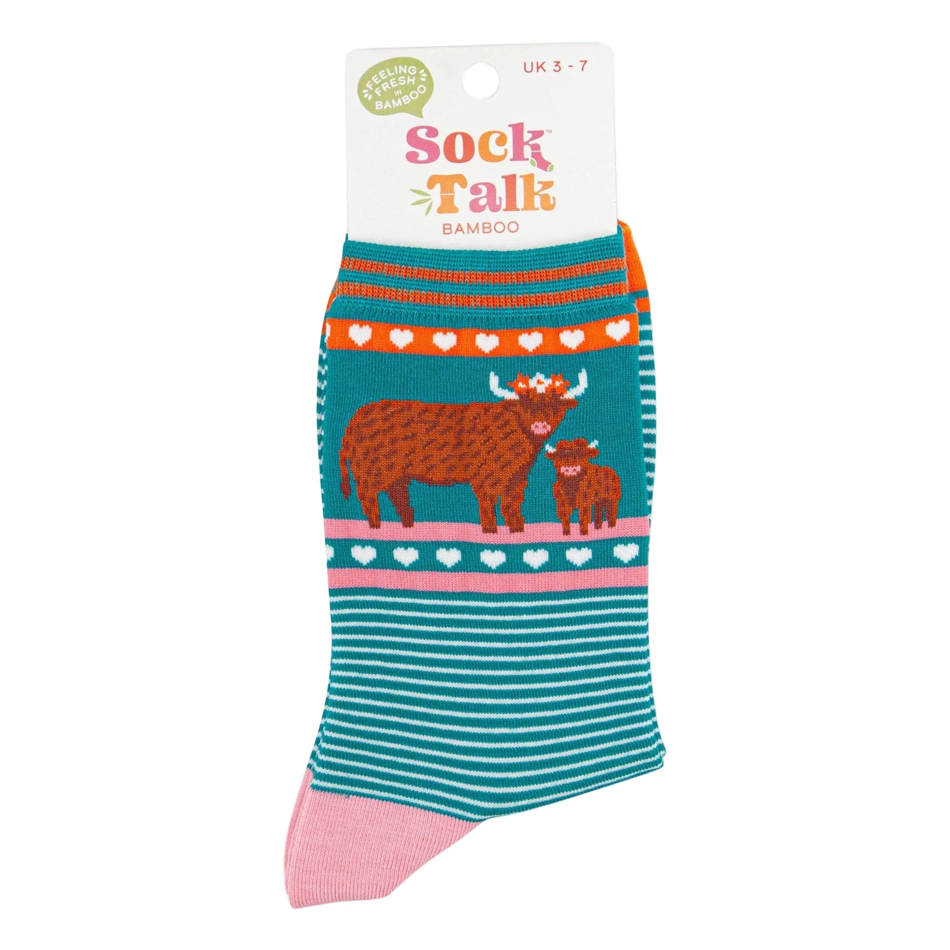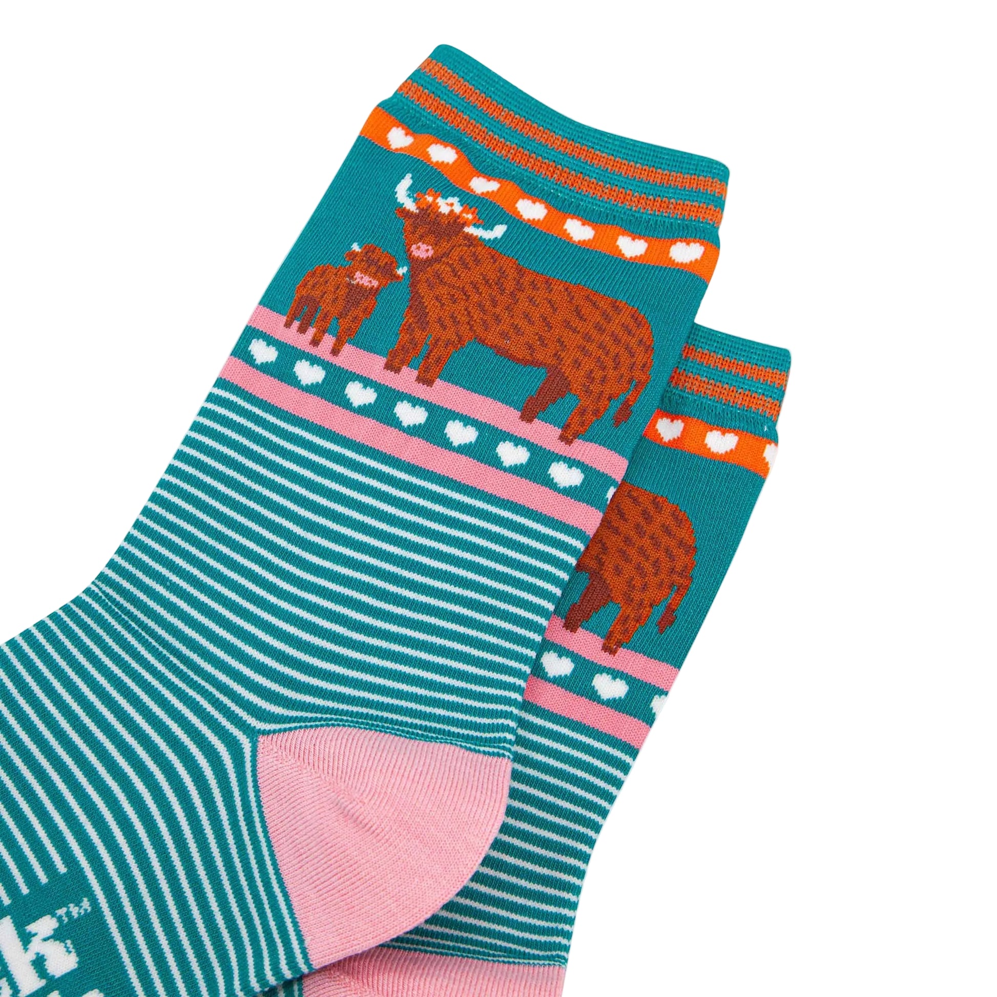 Women's Bamboo Socks - Teal, Highland Cow and Calf